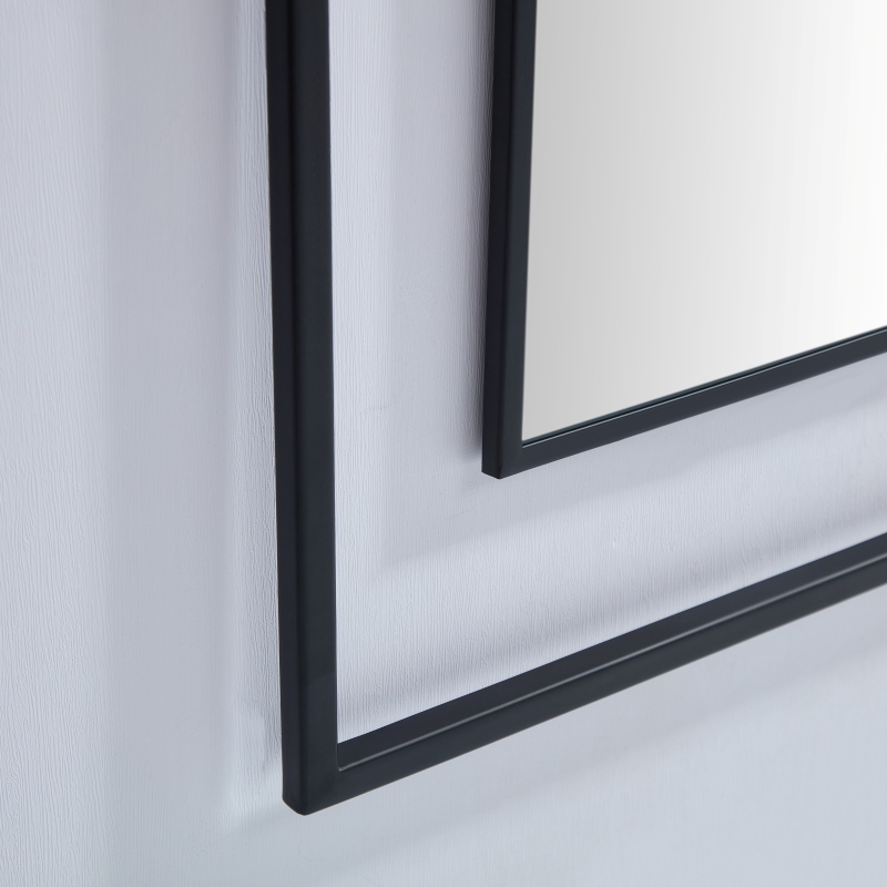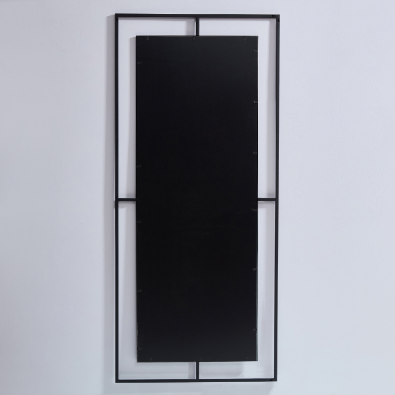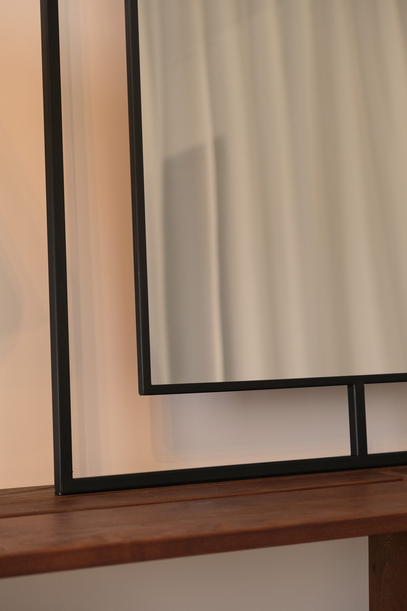 Het sterke zwarte frame is vervaardigd uit gepoedercoat staal, wat zorgt voor duurzaamheid en een strakke afwerking. Het heldere spiegelglas is krasbestendig en eenvoudig schoon te maken, zodat de spiegel altijd mooi blijft.